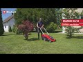 роторная газонокосилка, аккумуляторный двигатель, ширина обработки 42 см, гибридный травосборник на 50 л, 6 уровней высоты скашивания